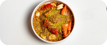 Pastacı kreması, lotus bisküvi, muz, çilek, sütlü çikolata, mini pancake, krep karışımı.